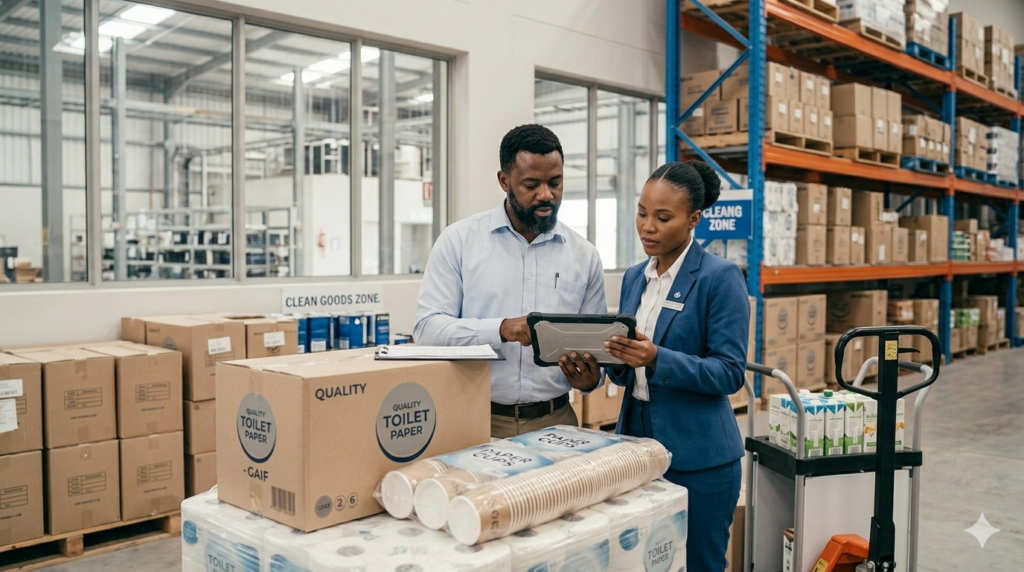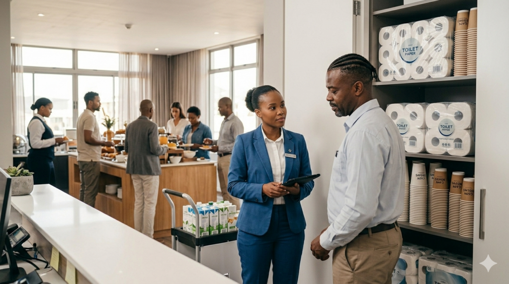 Supplying hygiene products such as toilet paper and paper cups for daily operational use.